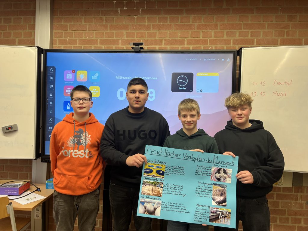Darauf sollte stehen: „Feuchttücher verstopfen das Klärwerk“. Wir stellten es der Klasse vor und hatten anschließend einen Termin mit der Böhme-Zeitung. Frau