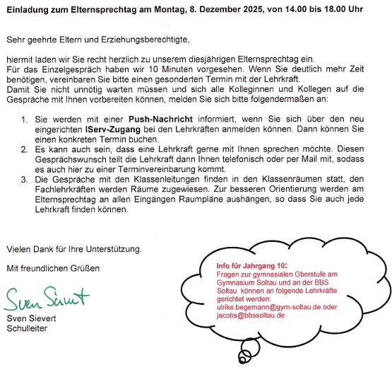 Elternsprechtag am 8.12.25 Veröffentlicht am 17. November 2025 Bitte entnehmen Sie Informationen zum Elternsprechtag folgendem Schreiben. Zurück zur Übersicht
