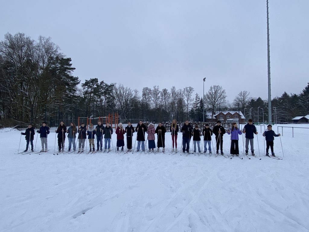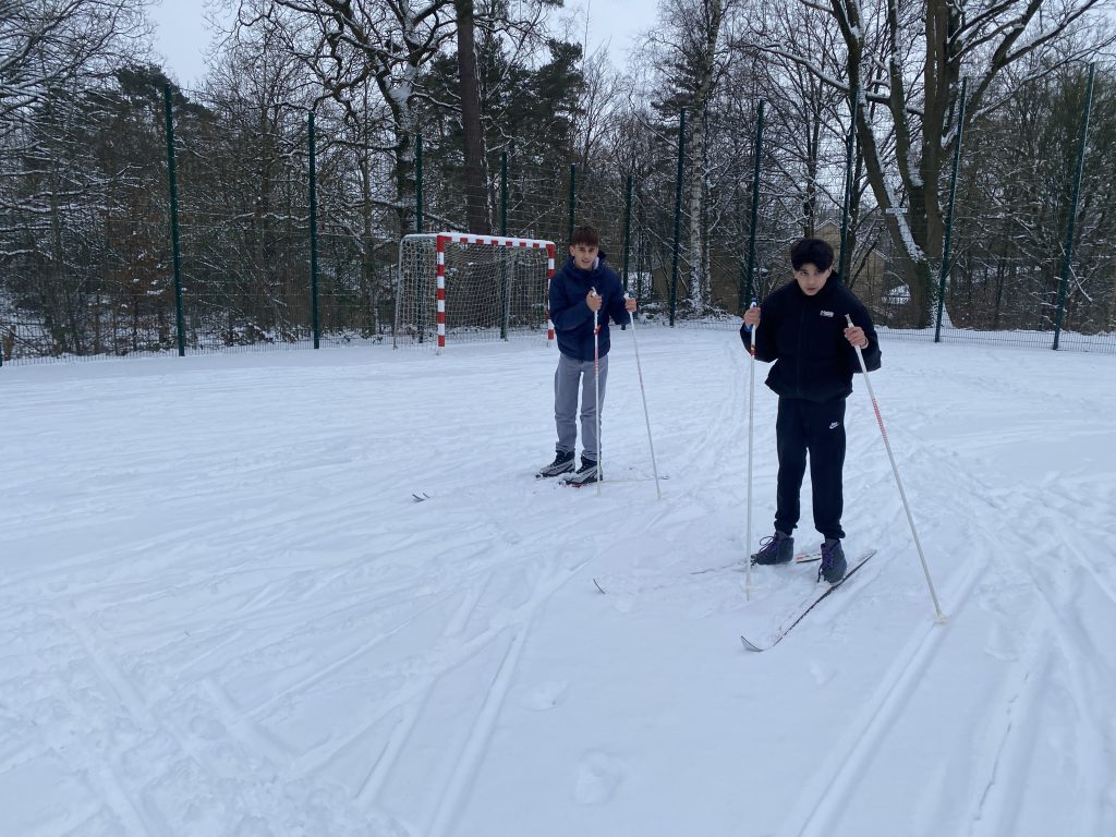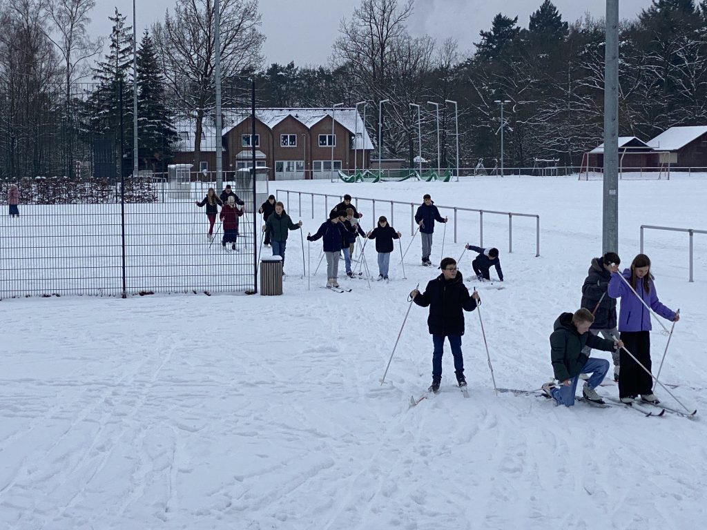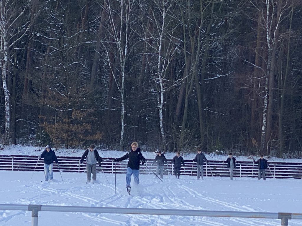 Die Klassen 10c und 6b durfte heute im Rahmen des Sportunterrichts ihre ersten Erfahrungen auf Langlaufskiern sammeln. Bei guten Schneebedingungen fand der Unterricht auf dem Gelände des angrenzenden Böhmerwaldstadions statt. Die 10c und 6b waren dabei nicht die einzige Klassen, die an diesem Tag auf Langlaufskiern unterwegs war – das winterliche Wetter wurde von mehreren Lerngruppen aktiv genutzt. Das benötigte Langlaufmaterial wie Ski, Schuhe und Stöcke stellte die Schule zur Verfügung. Dieses hatte seit dem letzten Einsatz über drei Jahre auf einen solchen Einsatz gewartet, da es aufgrund des Klimawandels während der Schulzeit immer seltener zu ausreichend Schnee gekommen war. Umso größer war die Freude über die aktuellen Bedingungen. Die Schülerinnen und Schüler zeigten viel Motivation, hatten sichtlich Spaß und erzielten schnelle Lernfortschritte. Nach einer kurzen Übungsphase waren sogar erste kurze Abfahrten möglich. Wir hoffen auf weitere Schneetage, damit auch noch andere Klassen in den Genuss des Langlaufunterrichts kommen können.